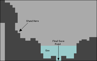 To enter this Secret World, you must first be at the final save point of the game. (Diagram 1) Space Jump up and through the secret passage in the ceiling, and into the goo. Then, Space Jump out of the left side of it. Move left from there to the first wall. Not the wall farthest to the left, but the smaller one at the base of it. Look at the example below to see the exact location that you must stand at.